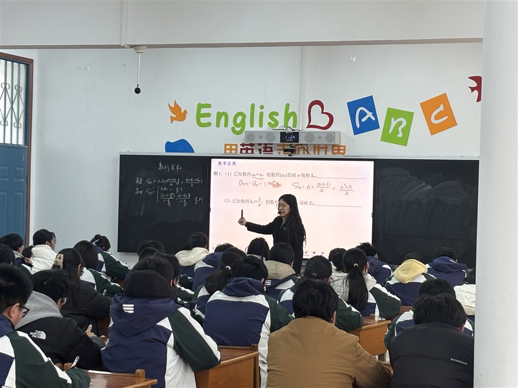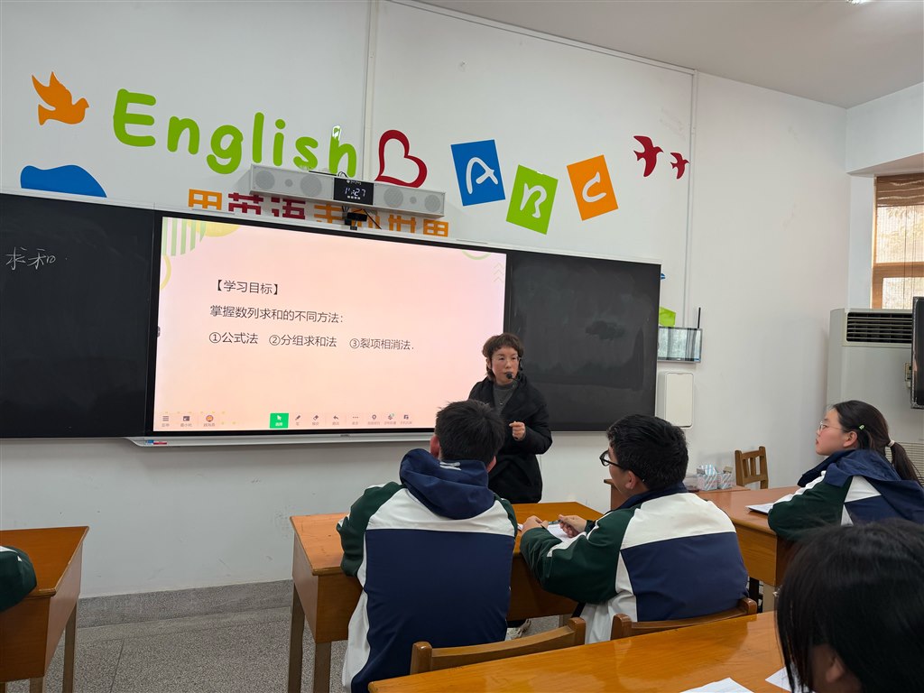 活动中,两位老师紧扣《数列求和》的教学重难点,结合学生的认知特点与学情实际,精心设计教学环节。领衔人顾海燕老师的课堂,注重知识体系的构建与逻辑思维的培养,通过层层递进的问题链,引导学生自主探究等差数列、等比数列求和公式的推导过程,借助多媒体课件直观展示解题思路,让抽象的数学知识变得生动易懂;蒋文欣老师则立足乡村学生的学习基础,以扎实的教学功底、亲切的教学语言,从生活实例入手引入课题,通过典型例题的精讲精练,帮助学生夯实基础,掌握错位相减、裂项相消等核心求和方法,课堂氛围活跃,师生互动频繁。