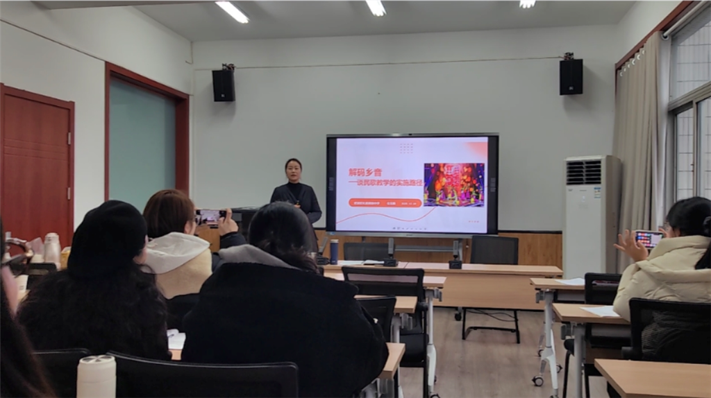 活动最后,戈玉燕老师结合其多年的研究与实践,开设了专题讲座《解码乡音——民歌教学的实施路径》。讲座系统梳理了民歌教学面临的现实困境,并基于生动的案例,从资源开发、课堂建构、评价创新及跨学科融合等方面,提出了一系列具体、可操作的实施策略与建议,为一线教师有效开展本土音乐文化教育提供了清晰的“路线图”与坚实的理论支撑。