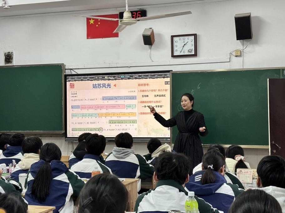 活动在领衔人礼嘉高级中学戈玉燕老师韵味悠长的示范课《江南情韵》中拉开序幕。戈老师以其深厚的学术功底和精湛的教学艺术,引领学生步入烟雨江南的音乐画卷。课堂以经典民歌《姑苏风光》为切入点,不仅对其历史渊源、文化内涵、音乐特色进行了细腻而专业的解读,更通过巧妙的互动设计,带领学生亲身体验“依字行腔”的演唱乐趣。学生们在学唱、比对、探讨中,深刻感知到同宗民歌“一曲多变”的独特魅力与鲜活的生命力。整堂课将知识传授、审美体验与文化传承融为一体,充分展现了民歌教学的深度与温度,为在场观摩的教师提供了极具启发性的教学范本。